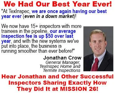At MISSION 26, you’ll meet successful inspectors who’ve come to us from every situation: solo operators in tiny towns, family husband-and-wife shops, even veteran multi-inspector firms. The common thread? Each experienced a transformation to their business that has multiplied their revenue and freed more of their time. We have a lot of great people in our community, but none of them have succeeded because they are any more “special” than you. They just followed the system.