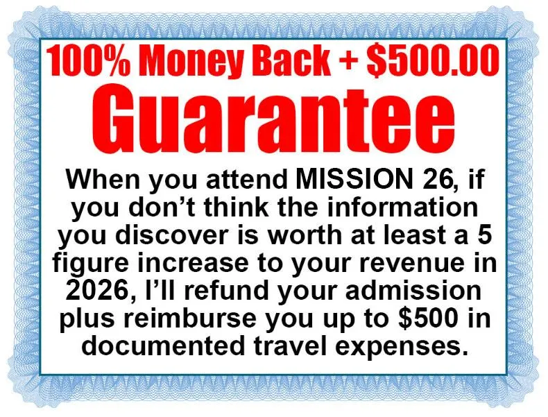 The only way I can afford to make such an unprecedented Guarantee is because I know the value of the amazing information we'll be sharing with you at MISSION 26!